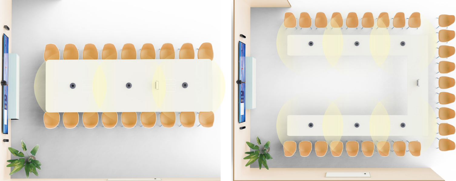 Chaque microphone individuel a une distance de captation effective de 3 mètres, et jusqu'à 6 microphones peuvent être enchaînés en utilisant Power over Ethernet (PoE), permettant une captation audio distribuée et une couverture uniforme dans les salles de conférence de taille moyenne à grande.