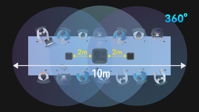Digitale microfoonarray met hoge signaal-ruisverhouding, primaire microfoon en uitgebreide microfooncascade-ontwerp, automatische beamforming 360° omnidirectionele langeafstand rechtlijnige geluidsopname, verbetert effectief de kwaliteit van audiogesprekken in vergaderruimtes.