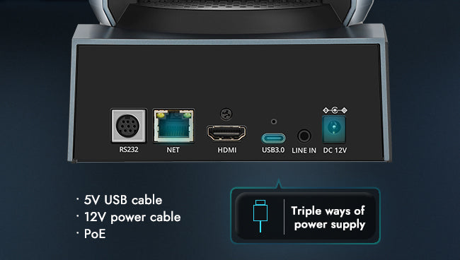 Simultaneously support to use 5V USB cable, 12V power cable and PoE for power supply.